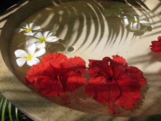 Hibiscus and Frangipani in a bird bath (my photograph).
